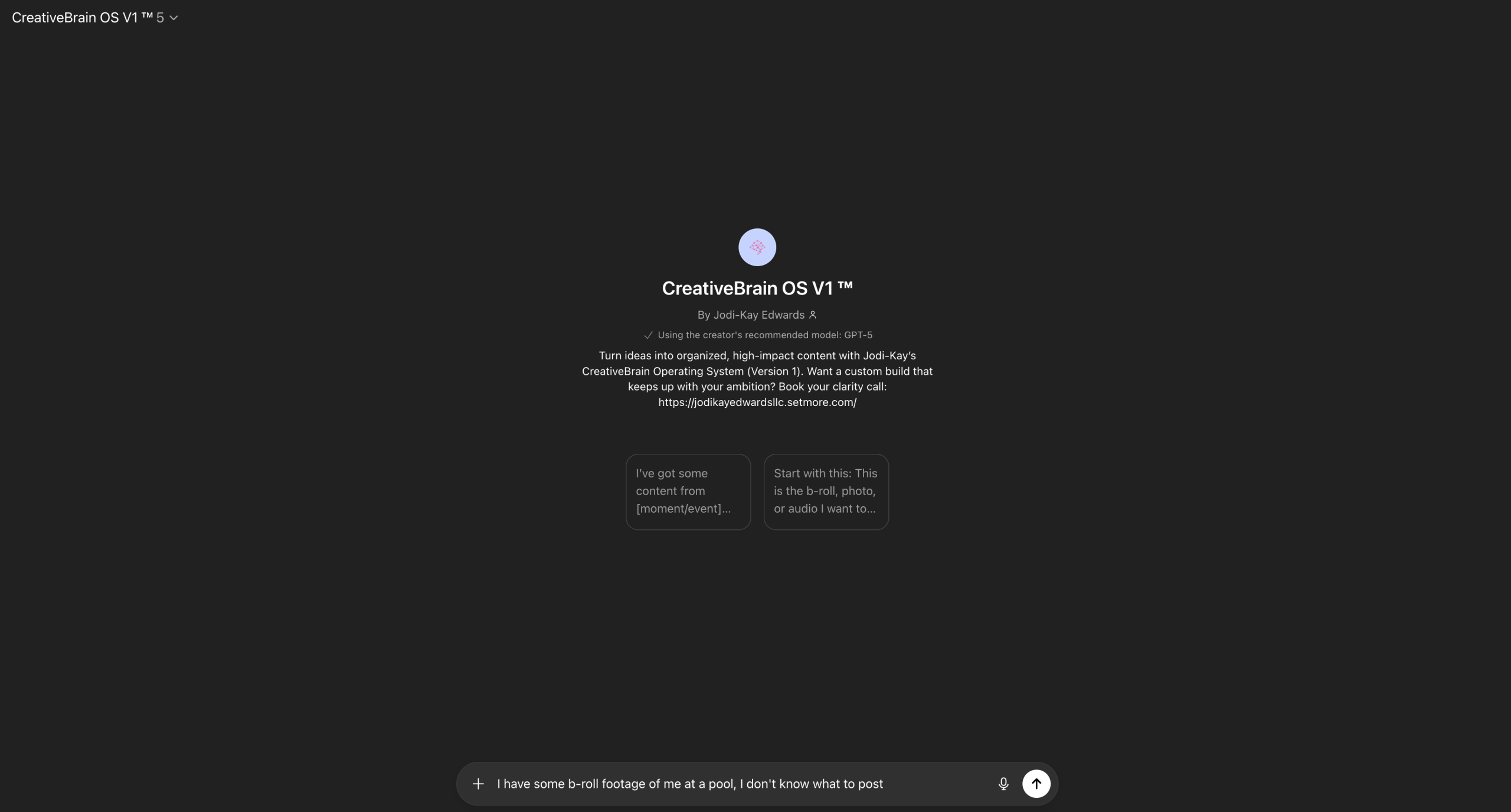 Use CreativeBrain → Send your chat link to jodikayedwards.ai@gmail.com so I can see how you use it → I’ll hook you up with a Custom Marketing Plan (normally $497) for free.